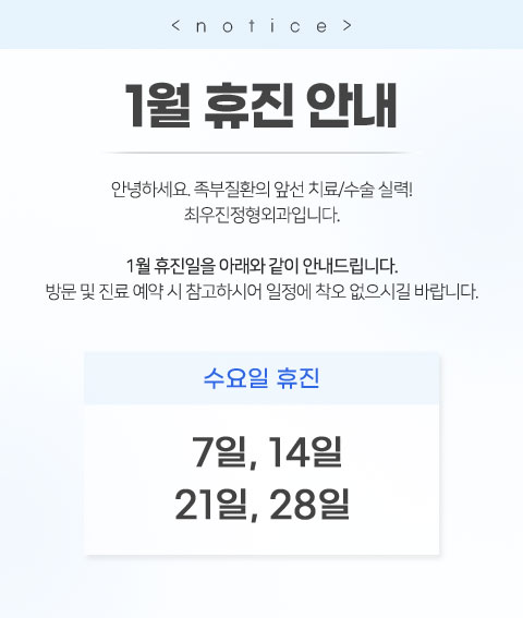 안녕하세요. 발/발목 질환 치료 및 수술에 새지평을 열어가는 최우진정형외과입니다.